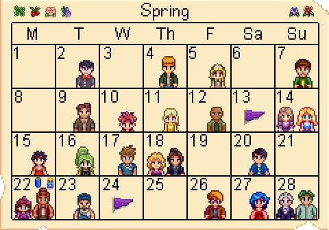 Stardew Valley Calendar - Stardew Valley Retrovolve, A calendar can be found on the front of pierre's general store (to the left of the door) next to the 'help wanted' board.. With it you are able to upgrade the game. The nicest thing is they are wiki calendars. This template can be used by entering the following onto a relevant page. The calendar is a piece of furniture that hangs on a wall. Below you will find all important information about the event and its place on the festival calendar: